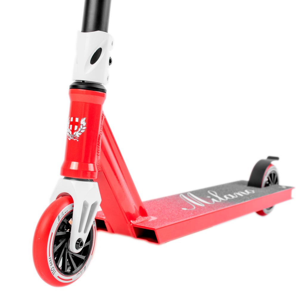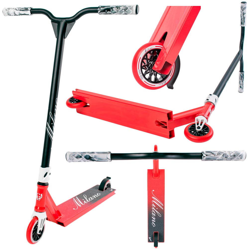 Помимо яркой и незабываемой внешности MILANO сочетает в себе роскошную окраску перламутром в красные и белые цвета, высокий и широкий руль, двухсторонние спицевые колеса Pro-уровня, фрезерованную вилку и удобную большую деку!